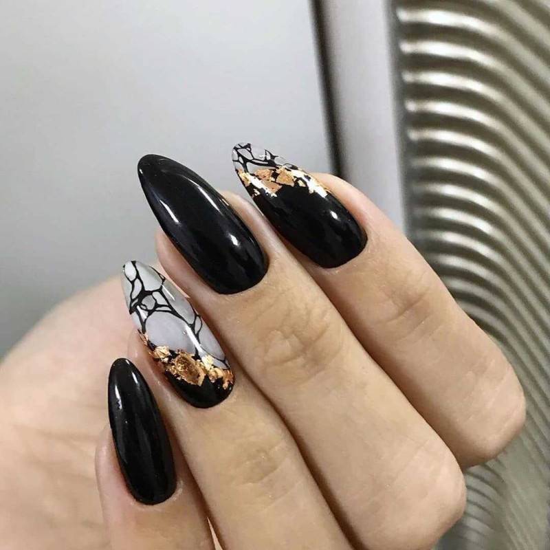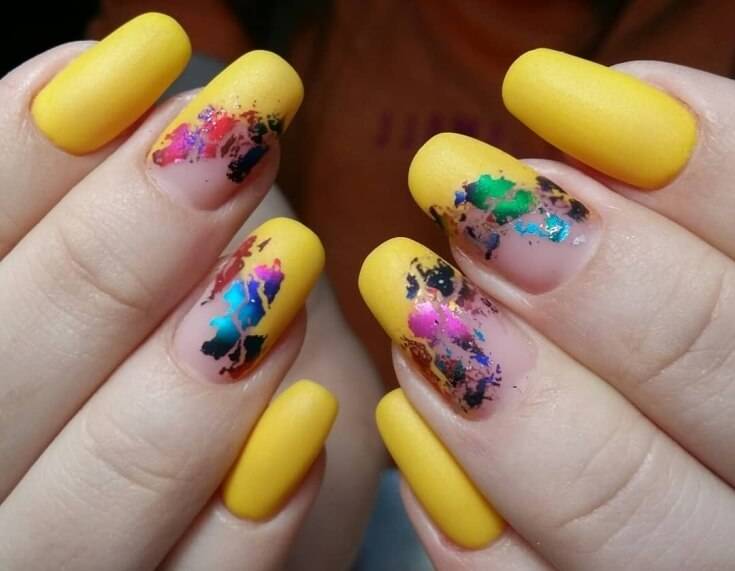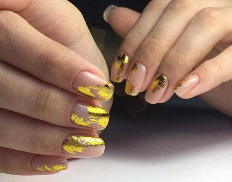 У этого материала есть много удивительных вариантов использования, чтобы подходить к ногтям разной длины. Вы можете использовать желтую или похожую золотую фольгу в сочетании с глубоким темным цветом, чтобы создать королевский маникюр. Если вы хотите осветлить изображение, было бы неплохо использовать желтый цвет в качестве фона и наложить на него пленку. Для этого подойдет голографический, тисненый или гравированный листок. При выполнении маникюра можно полностью покрыть фольгой один-два ногтя. Для более запоминающегося эффекта предлагается весь маникюр украсить фольгой. Иногда в сочетании с сусальным золотом используются небольшие наклейки в виде бабочек или изображают узоры, рисунки (чаще всего с фруктовым или овощным мотивом) и геометрические линии.