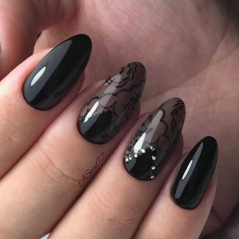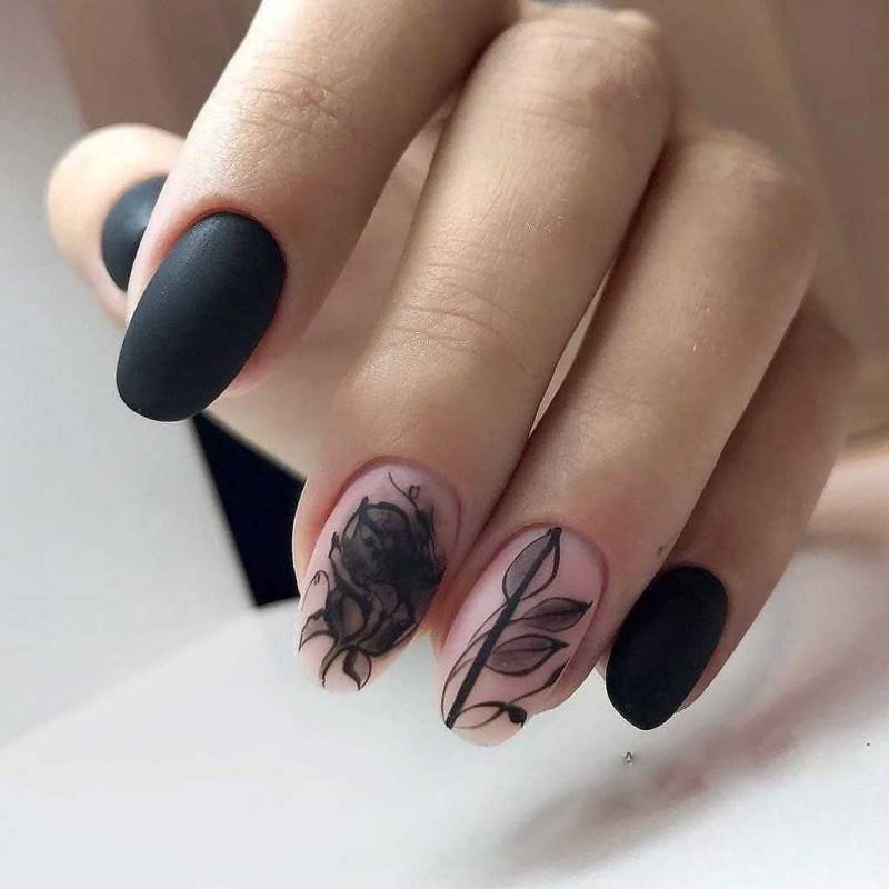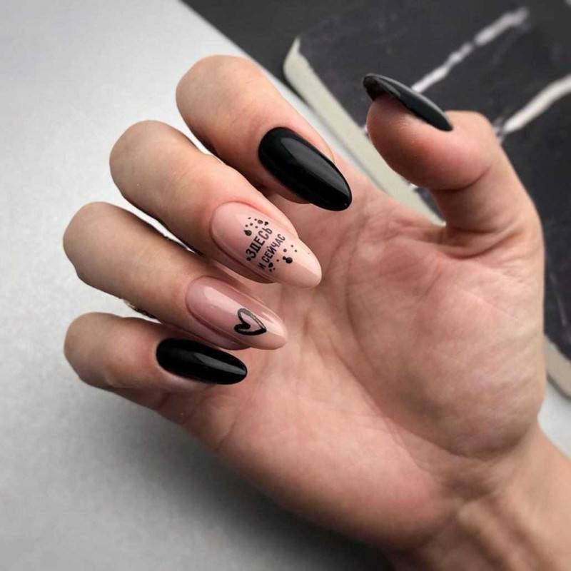 С чёрным. Если вы боитесь слишком смелых экспериментов – отдавайте предпочтение именно этому дизайну ногтей. Выглядит он не броско, но выразительно. Приветствуется педикюр с геометрическим дизайном или четким цветочным орнаментом.