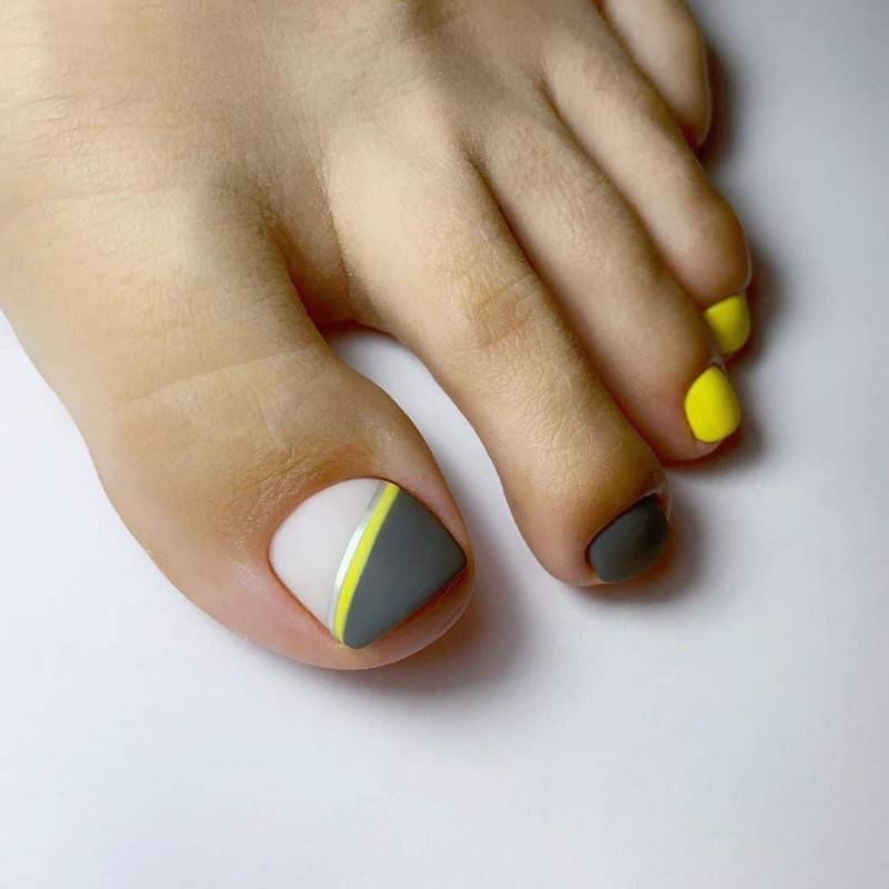 С серым. Лимонный цвет светлых оттенков и приглушённый серый гармонично сочетаются между собой. В особенности, если украсить ногти на ножках лунным дизайном.