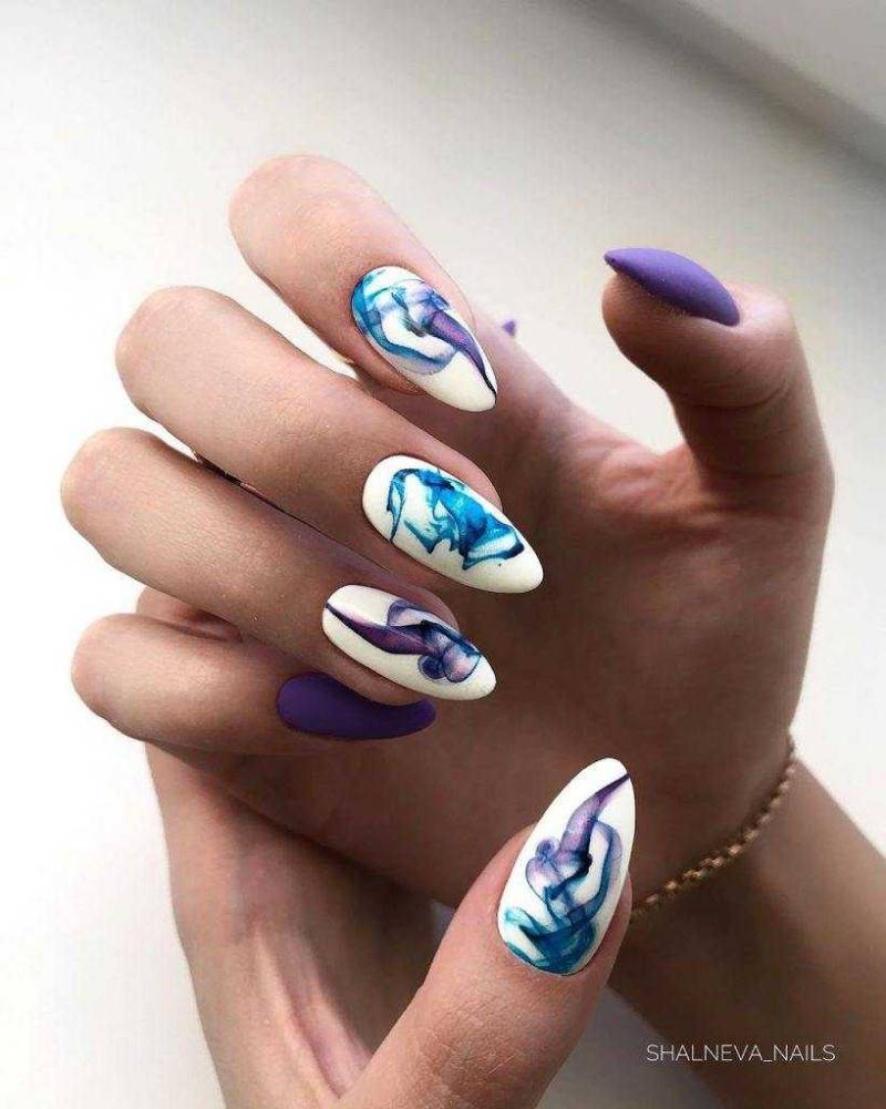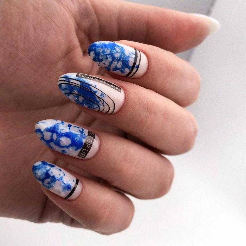 - Можно дополнить дизайн «мрамором», то есть на непросушенный первый слой гель-лака нанести тонкие извилистые линии белым цветом и молочным.