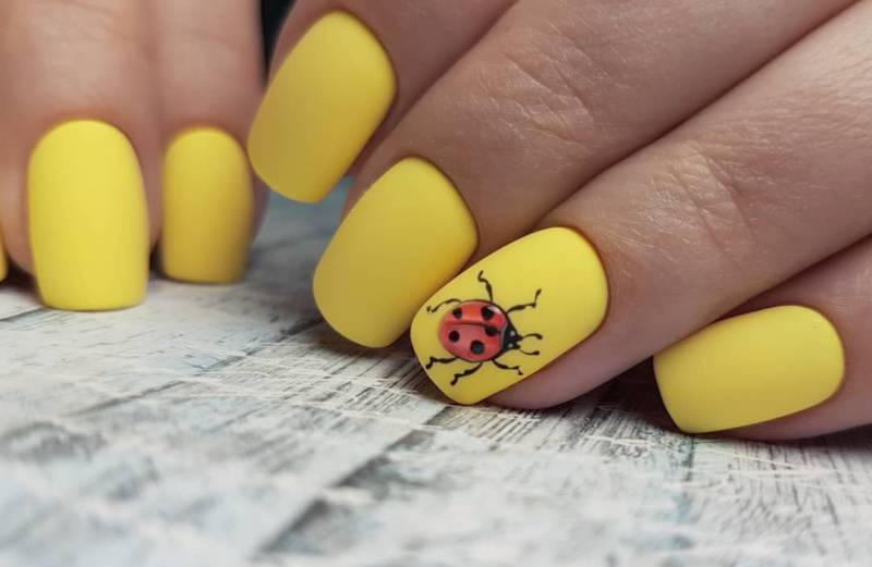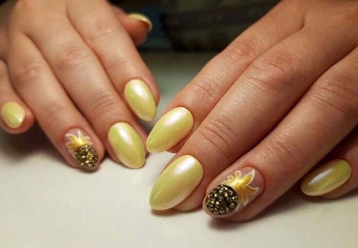 Несмотря на то, что в летнем маникюре желтого цвета приветствуется большое количество декора и акцента, если у вас очень короткие ноготки, все же стоит ограничить себя в «полете фантазий» двумя-тремя акцентами. Если ногти чуть отросшие, то уже можно смело экспериментировать.