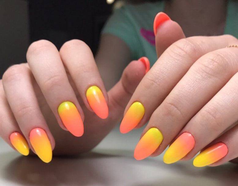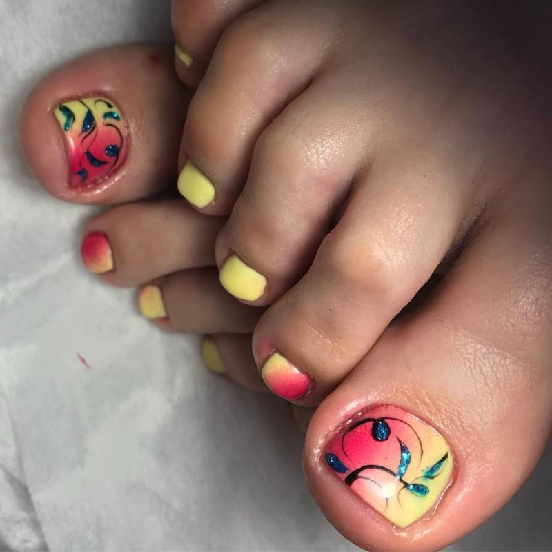 С оранжевым. Так как жёлтый и оранжевый близки по цветовой палитре, педикюр в таком дизайне будет весьма лаконичным. С использованием матовых лаков или ярких оттенков можно сделать градиент, который станет хитом в летний дизайн вашего педикюра.