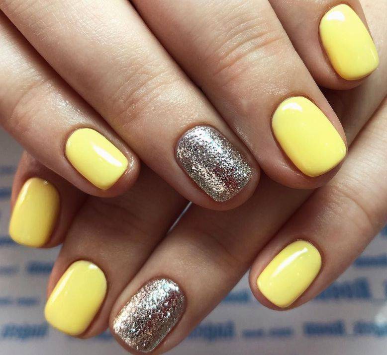 С серебром. Тёплые оттенки жёлтого педикюра очень удачно смотрятся с однотонным покрытием серебристого. Лучше всего использовать солнечный цвет пастельных оттенков и глиттерный серебристый лак.