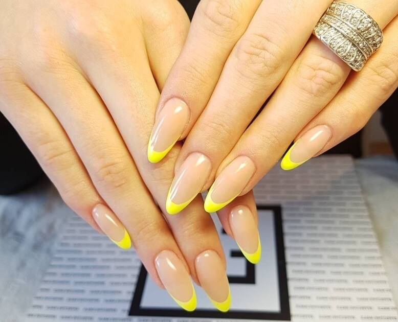 Но куда веселее и ярче смотрится френч в дизайне ногтей желтого цвета (фото), а именно ярко-желтого. Такой насыщенный пестрый солнечный цвет обязательно привлечет к себе внимание