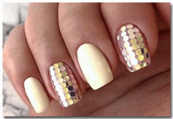 Обычно пайетки наносят на средний и безымянный пальцы (выделяя дырочки или полосы пиджака), полностью закрывая ими пару ноготков или выполняя геометрический узор с блестящими элементами. Независимо от того, что вы выберете, блестящий дизайн будет отлично смотреться с глянцевым или матовым покрытием.