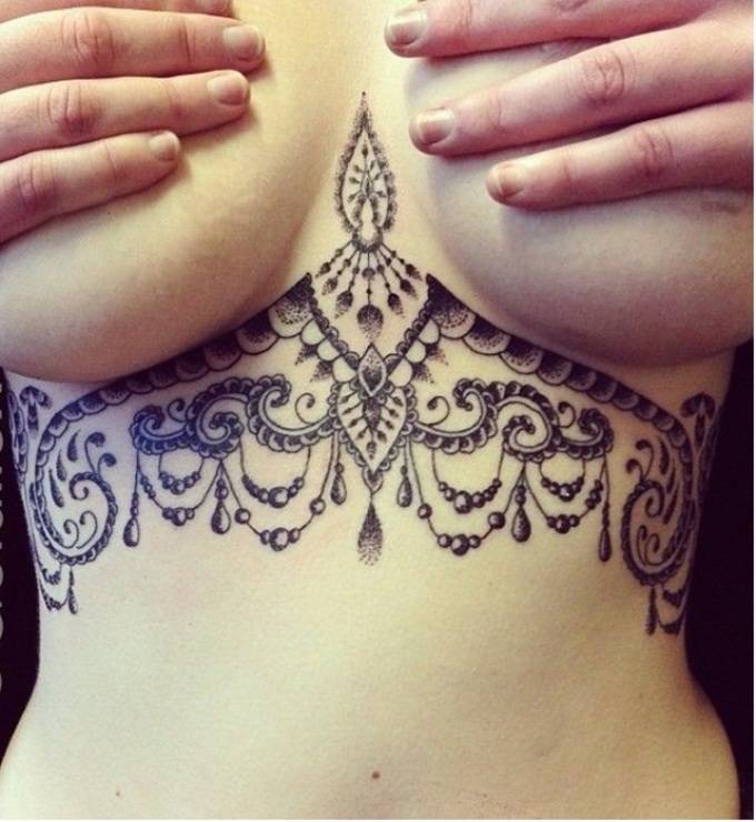 , поскольку кожа в этом месте очень чувствительная. А вот над грудью или под нею слабый пол часто набивает такие татуировки, которые похожи на колье, подвески, разнообразные ажурные переплетения.