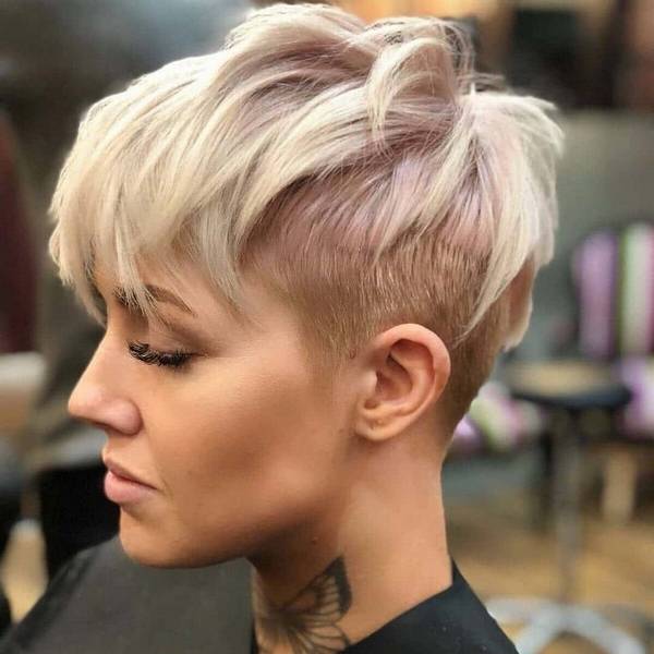 Пикси. Волосы на висках и затылке выстригают максимально коротко, оставляя на макушке объем и торчащие пряди в виде перьев. Она подходит для овальных худых форм лица.