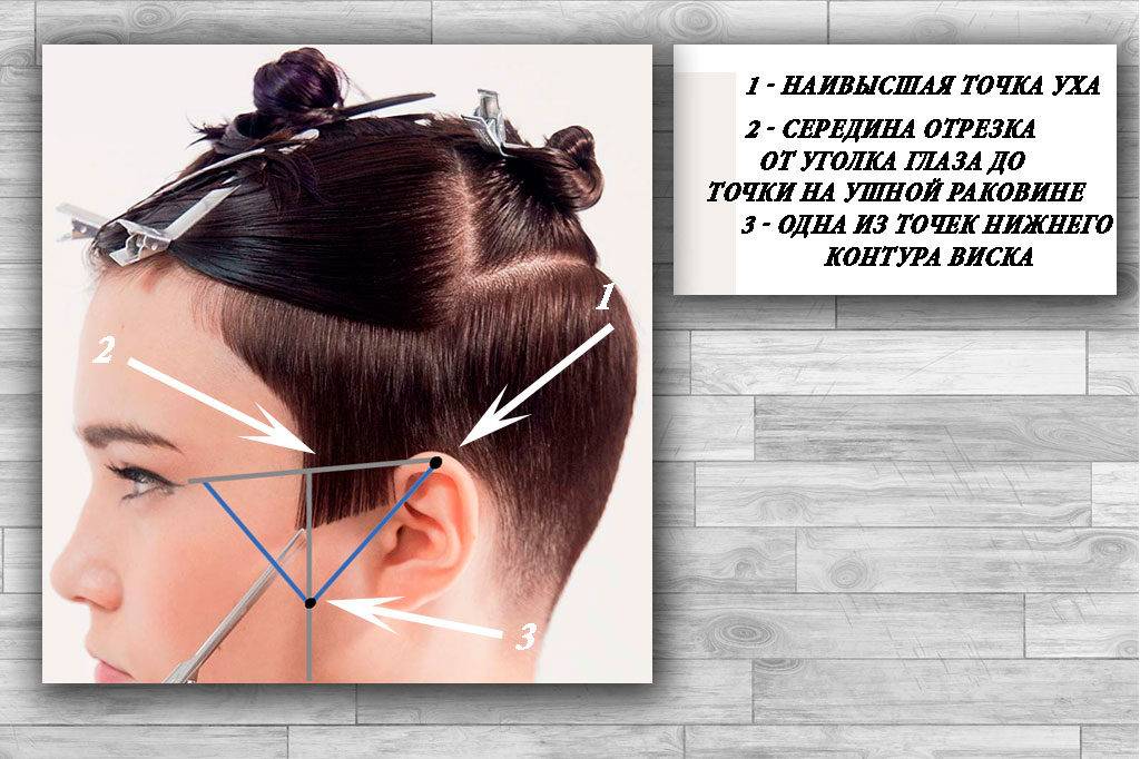 Чтобы получить красивый силуэт виска, соединяем внешний уголок глаза, верхнюю ушную точку и нижнюю метку височного контура. Передвигаем нижнюю отметку вдоль ранее полученной вертикальной линии, и получаем разнообразные височные силуэты, из которых легко выбрать нужный нам результат. Выполняя эти рекомендации, мы получим идеальный висок, который будет соответствовать типу лица.