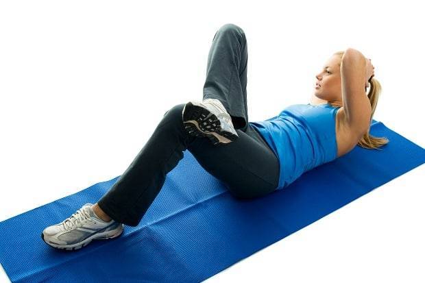 Не касаясь плечами поверхности коврика, выполняем 10 повторений, отдыхаем пару минут, выполняем еще 10 повторений.