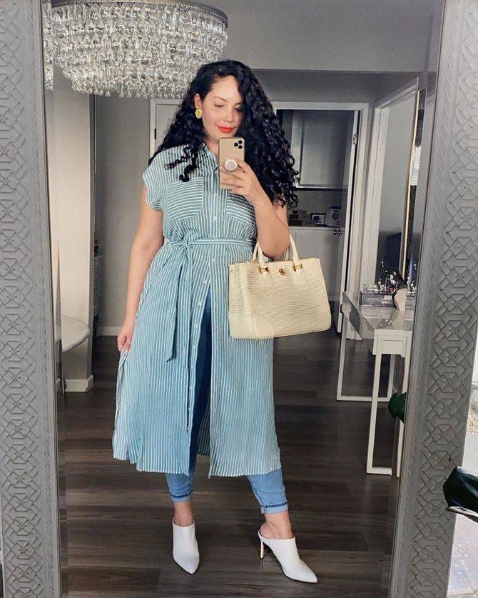 - Ее величество вертикаль. Ваша задача – максимально вытянуть фигуру, сделать ее стройнее и легче. Вы можете надеть прямые джинсы с завышенной талией, удлиненный топ, каблуки и легкий кардиган, и ваша фигура заметно преобразится.