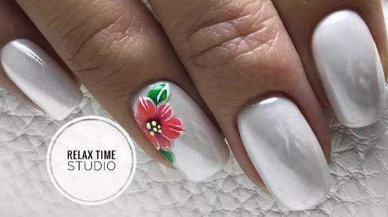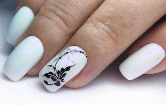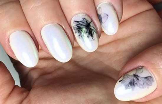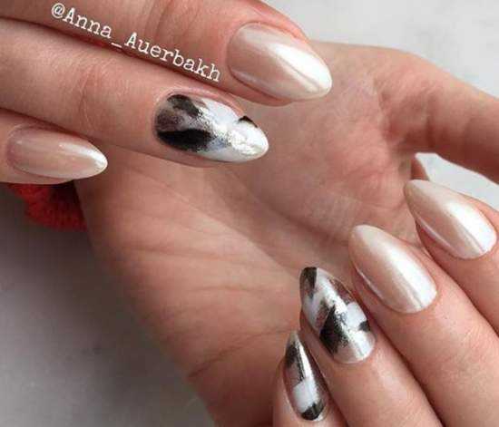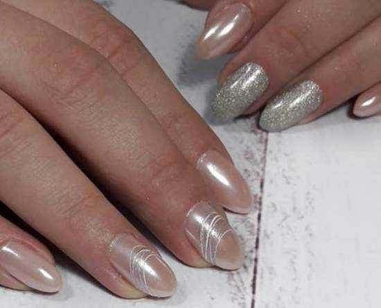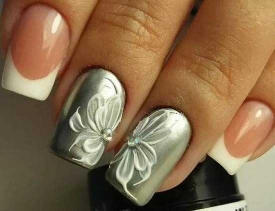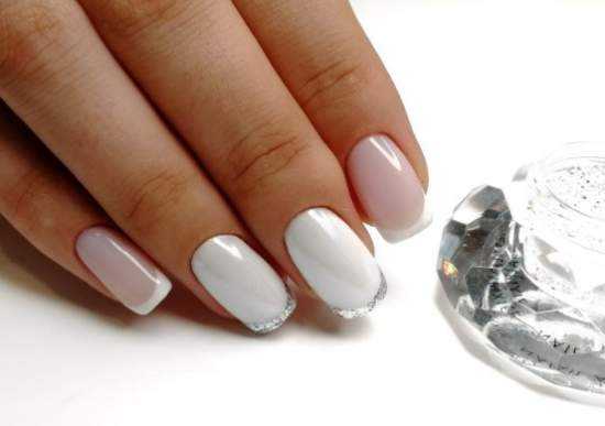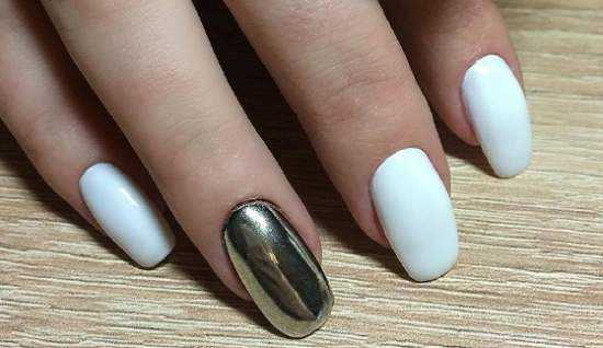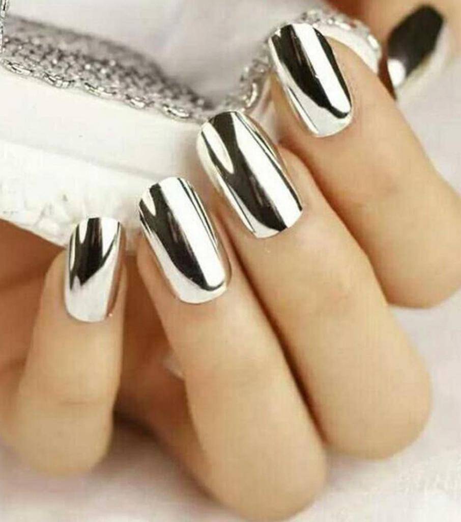 «Классикой» можно считать зеркальный маникюр. Его выполняют с помощью серебристой пудры. Покрытые белым гель-лаком ногти с втиркой серебристого цвета – универсальный вариант, который сочетается с повседневным гардеробом и может легко дополнить праздничный образ. Пудру можно нанести на 1 – 2 пальца, чтобы не перегрузить дизайн.