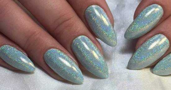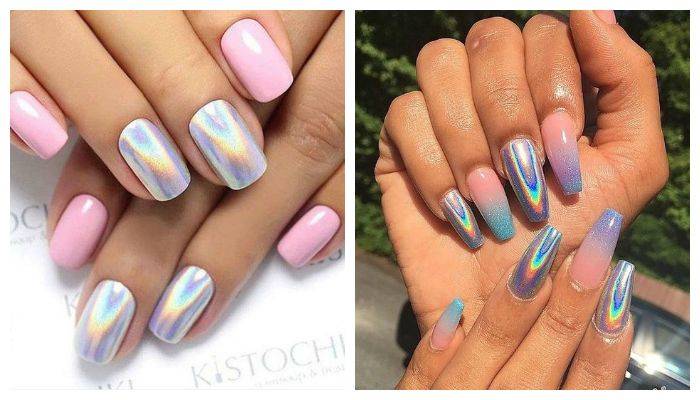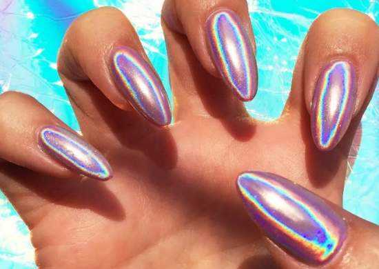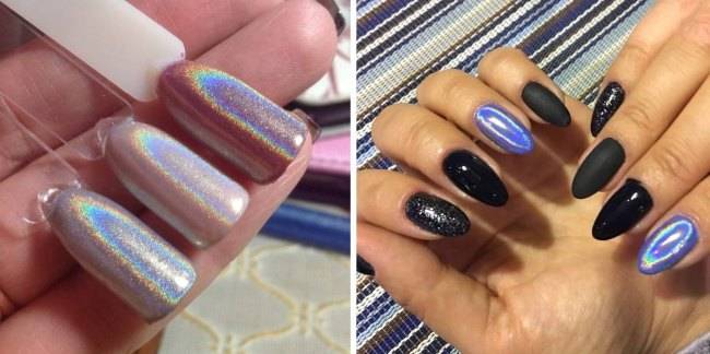 Не менее популярна у девушек пудра с голографическим эффектом. Она легко дополнит маникюр в ярких оттенках, но наиболее выигрышно она смотрится в сочетании с чистым белым цветом. Голографический эффект приковывает взгляды окружающих и заставит их с интересом разглядывать ваш маникюр. Покрытие обладает эффектом призмы, преломляющей солнечные лучи. С его помощью можно создать эффект разлитого в луже бензина.