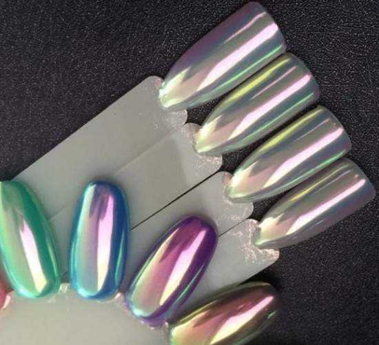 Очень выразительные ногти создают, используя хромовые пудры с эффектом хамелеона, которые переливаются различными тонами. Стоит изменить освещение или подвигать руками, как такое покрытие изменяет расцветку. Чем плотнее нанесен слой глиттера, тем будет более выражен перелив.