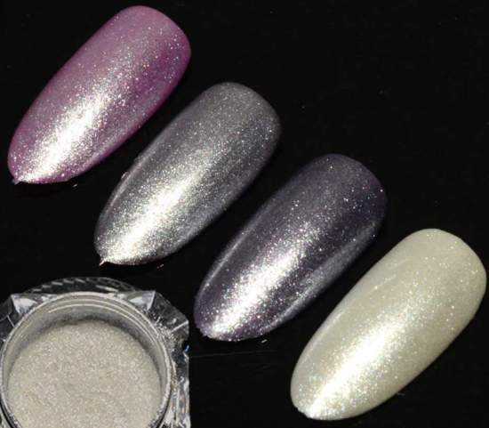 Для получения благородного мерцания можно использовать пудру (металлический пигмент) для зеркального маникюра. Формула такого продукта позволяет за считанные секунды получить обворожительные переливы. Пудра представляет собой порошок алюминия очень мелкого помола. Великолепно втирается в лаковое покрытие. При использовании втирки, следует помнить о том, что получить красивое зеркальное покрытие можно только на ровных ногтях. Поэтому при их оформлении следует использовать выравнивающую базу, которая сможет скорректировать имеющиеся недостатки.