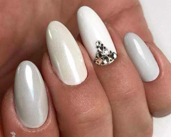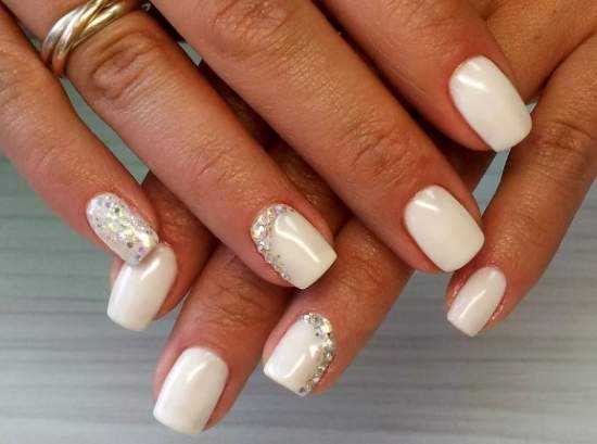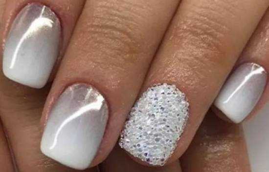 Любительницам блеска камней понравится алмазная втирка. Ее можно нанести на все ноготки, используя в качестве подложки белый гель-лак. Такой маникюр будет смотреться ярко и эффектно.