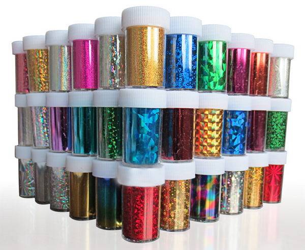 - Переводная фольга с отражающим эффектом. Ее цветовая гамма очень разнообразна, но для первого раза советуем ограничиться серебристым или золотистым цветом. Приобрести ее можно в магазинах, продающих товары для нейл арта или заказать в интернете.