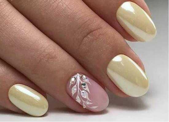 Еще один любимец девушек – белый маникюр с жемчужной втиркой. Он выглядит очень женственно и деликатно. Отблески жемчужной пудры в сливочных тонах создают имитацию натурального жемчуга на ногтях. Таким нежным эффектом можно дополнить классический френч, белый однотонный маникюр, свадебный дизайн для невесты, нейл-арт для выпускного вечера или романтического свидания. Кстати, жемчужная «пыльца» имеет несколько вариаций. В ней могут преобладать различные цвета: розовый, бежевый, белый, голубой, нежно-зеленый. В зависимости от оттенков переливов с помощью жемчужной втирки можно создать эффект рыбной чешуи, пыльцы единорога, звездного сияния.