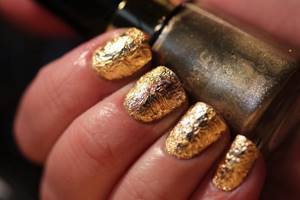 Великолепный золотистый Основной недостаток метода в недолговечности. Без верхнего слоя маникюр продержится один день. Если его сверху обработать прозрачным лаком для стойкости, утратятся яркие переливы.
