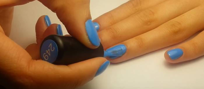 - Сверху нанести лак другого цвета, при этом желательно не прикасаться к декору, потом просто снять маникюрную ленту и высушить ногти надлежащим образом, в зависимости от покрытия.