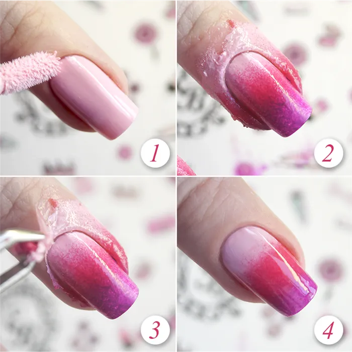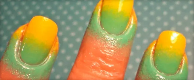 Водный маникюр с использованием жидкой ленты приобретает аккуратный целостный ид. Для того чтобы выполнить такой дизайн ногтевых пластин, потребуется несколько лаков разных цветов, тазик с водой, ватные диски и, конечно, сама жидкая лента. Лак разных цветов поочередно выливается в воду, а затем оперативно в состав опускается ноготь, после того, как состав высыхает, жидкую ленту просто поддевают и удаляют с кожи. В конце применяется топовое покрытие, чтобы маникюр как можно дольше сохранял свою привлекательность. Градиентный маникюр с использованием жидкой ленты создать очень легко. Это маникюр с плавным переходом одного цвета в иной. Для его создания потребуется иметь губку и лаки разных цветов. Лак нужно наносить на поверхность губочки и легким движением переносят его на ногтевую пластину. Губку нужно аккуратно прижимать, дабы создать эффект плавного перехода цвета. Конечно, такая техника не позволяет создать идеально накрашенные ногти, губка переносит лак не только на ноготь, но и на палец. Соответственно руки приобретают неаккуратный вид