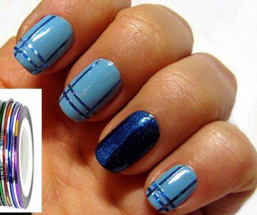 Морской мотив. Популярный рисунок «тельняшка» сделать с помощью синих клеевых полосок очень просто. Достаточно покрыть все ногти или отдельные пальцы белым лаком и наклеить поверх него полосы синего или голубого цвета (фото).