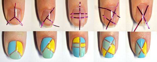 Дизайн с узорами. Лентами можно выделять прорисованные гель-лаками или акриловыми красками фигуры или же конструировать их при помощи самих полос.