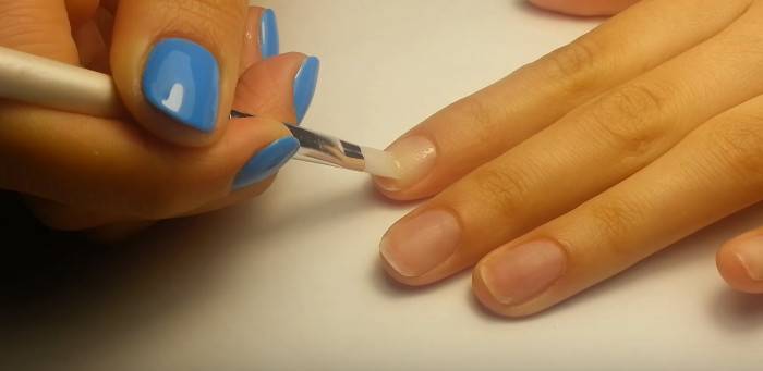 Это средство представляет собой вязкую жидкость, которая после применения на поверхности кожи застывает. Чтобы маникюр получился действительно привлекательным, утонченным и долговечным, состав посредством использования кисточки наносят максимально близко к ногтевой пластине. Средству дают высохнуть некоторое время (от 1 до 3х минут), пока не образуется плотная пленочка, далее можно переходить к выполнению нейл-арту, вне зависимости от его вида.