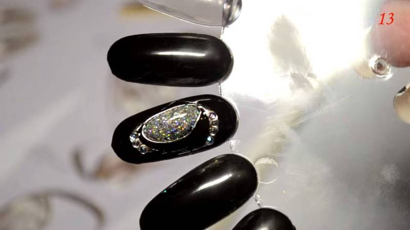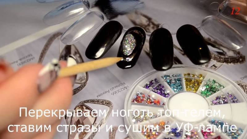 Помимо этого можно использовать гель для финишного покрытия. Это создаст эффект того, будто камни под стеклом. Также для этой цели разрешается покрытие гелем-лаком, правда, как уже говорилось, после этого необходима тщательная просушка.