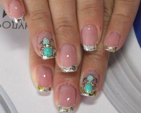 Теперь аккуратно очертите клеем границы и наложите на него кусочки фольги выбранного цвета. В зависимости от цветового исполнения всего маникюра подбирается фольга. Некоторое время выждав, фольга приклеится, и тогда резким движением ее надо оторвать. На ногте останется только красивый блестящий орнамент, который и будет обрамлять камушек.
