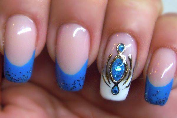 Касаемо длины: на средний или коротких ногтях будет хорошо смотреться 1-2 камня, которые будут помещены на 1-2 пальца одной руки. На маленьких ухоженных ногтях можно сделать россыпь мельчайших капель жемчуга или изумрудных осколков. Одним из оригинальных решений станет жидкий камень, окружённый пером павлина.