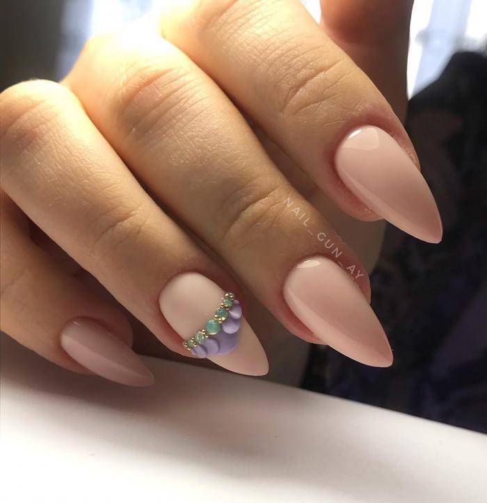 Не забываем что в сезоне 2020 остаются в тренде нюдовые покрытия в матовом варианте. Они отлично смотрятся в комбинации с красивой инкрустацией. Получается нейтральный и в то же время богато украшенный дизайн.