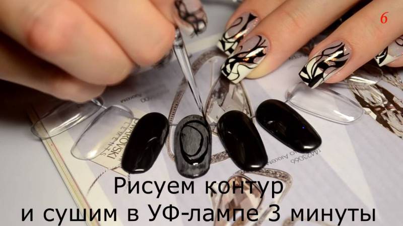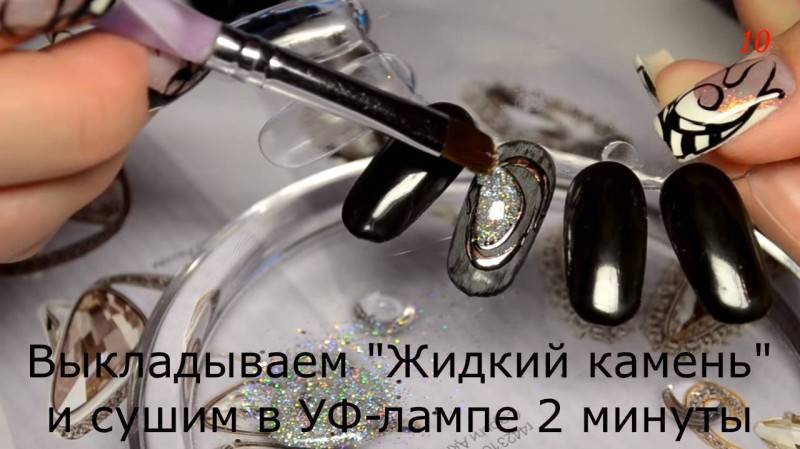 – это непосредственное начало выполнения жидких камней. Для этого из всех заранее подготовленных необходимых материалов и инструментов выбирается кисть-«волосок» и черный гель. На ногте средними по толщине линиями прорисовывается узор по технике «литье». Основной для него может послужить дизайн металла на кольце или броши с обязательной прорисовкой места камня, как правило, округлой или овальной формы.