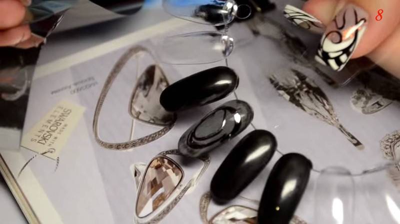 Эти камни наиболее эффектно смотрятся на черной или белой подложке. Также рекомендуется использовать камуфляж. Вы можете полностью покрыть ноготь узором, а можете покрыть лишь частично, как показано на фото выше. В последнем случае для обрамления камня подойдет литье, хроматический гель-лак или густые блестки.