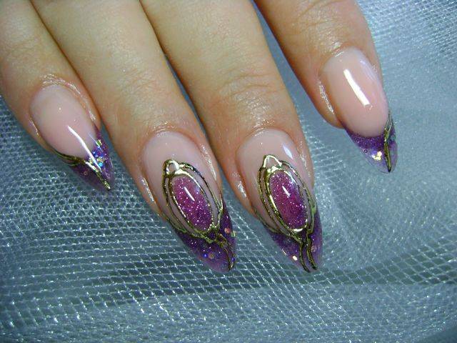 - В центр выкладываем гель для наращивания, смешанный с фиолетовой витражной краской или фиолетовой гель-краской.