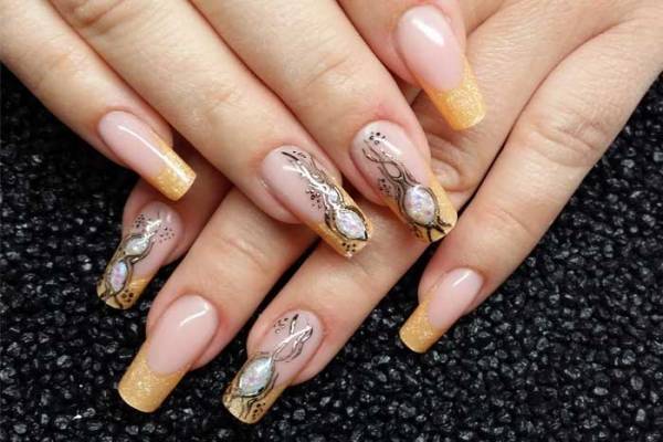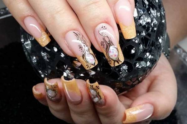- Покрываем золотистые вензеля топом, сушим в лампе.