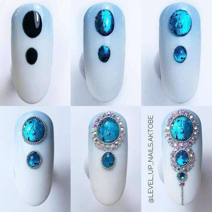 – нанесение витражного геля кистью-«волоском». Оттенок его зависит от того, какой именно камень прекрасная дама желает воспроизвести. Так, например, для создания изумруда на желтый фон следует наложить лазурный витражный гель, для сапфира – тот же витражный гель покрывает уже серебряный фон, а вот для россыпи рубинов следует покрывать черную подложку красным витражным гелем. В приводимом же примере пошагово выполняемого дизайна камня получится мягкий переход от зеленого к лазурному. Добившись желаемого, прекрасная дама снова должна просушить ноготок.