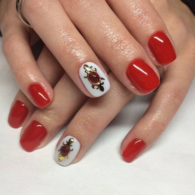 На фото показан роскошный красный маникюр с инкрустацией камнями разного размера. Дополнительно можно использовать бульонки и кусочки отрывной фольги.