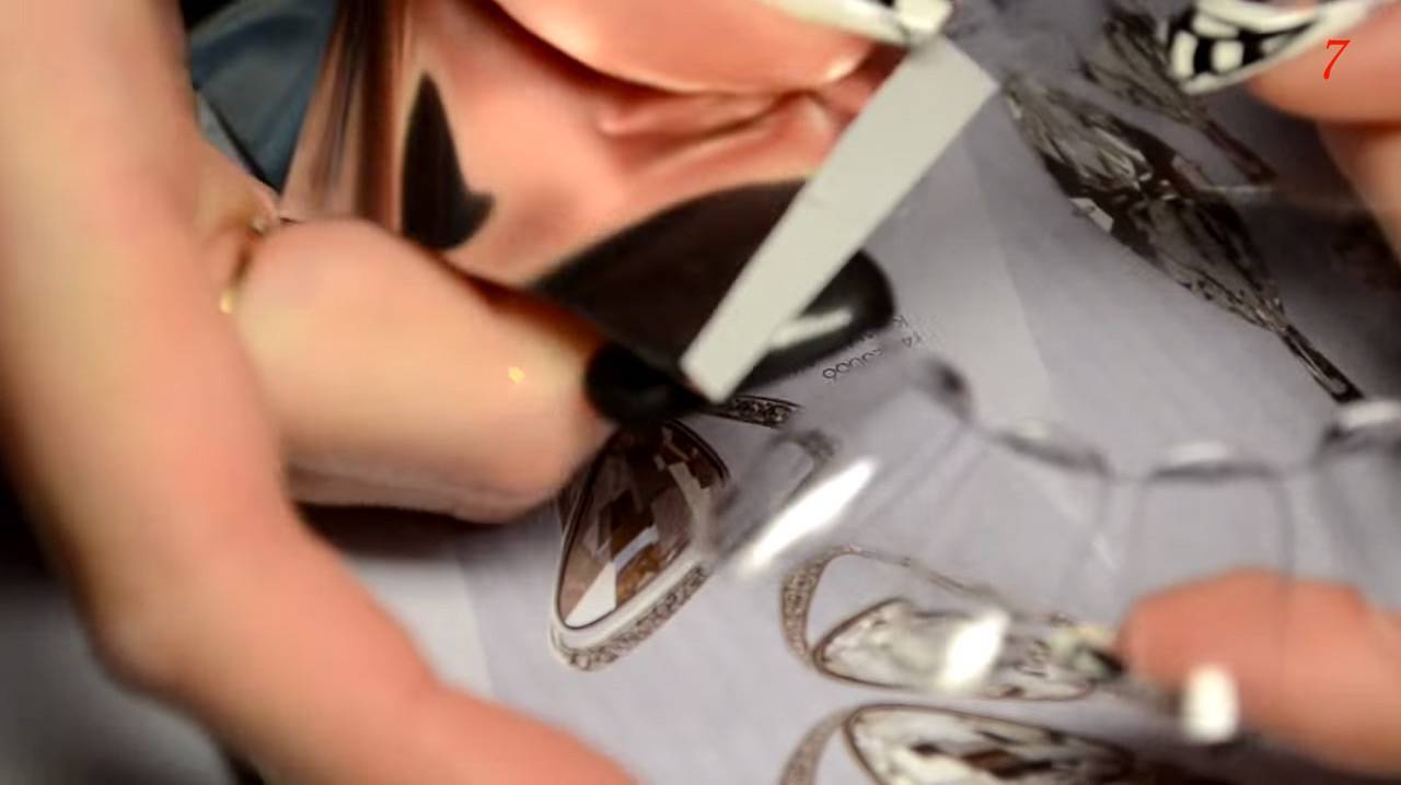 Сначала нужно подобрать узор, а затем его аккуратно вырезать из фольги (совет пригодится при использовании непереводной фольги). С результатом не помешало бы предварительно ознакомиться на фото. Готовый узор сажают на липкий слой лака, а затем закрепляют результат прозрачным лаком. Интересный результат получится, если мелкие кусочки фольги посадить на лак и чем-нибудь не очень острым выложить их на ногте в интересный узор.