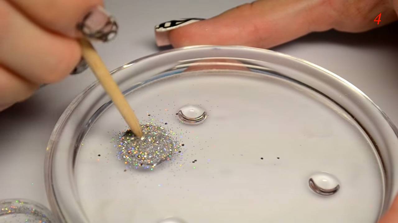 - Чтобы создать сами камушки, нужно замешать материал. Состав: очень густой каучуковый топ, немного белого гель-лака и совсем маленькая капелька голубого или синего оттенка.