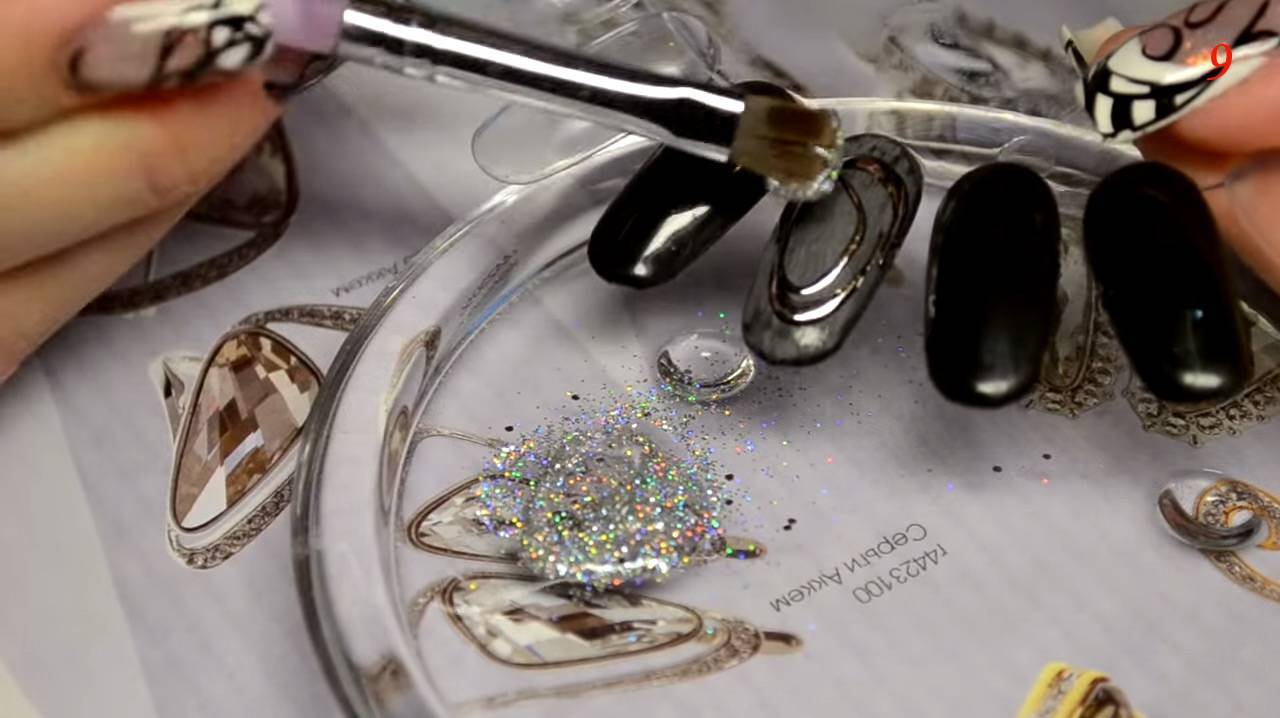 Как крепить стразы, вы уже знаете, поэтому подробнее остановимся на выполнении легкой растяжки блестками.