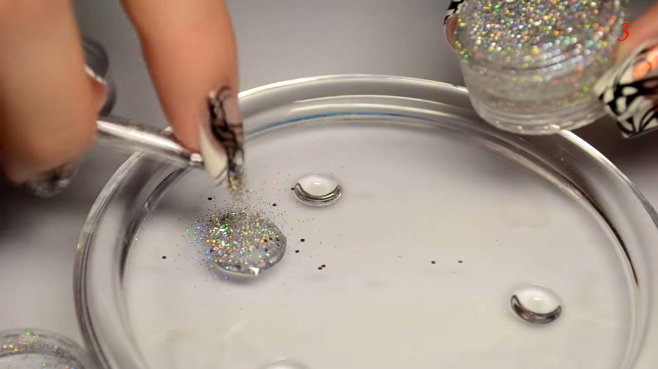 Определив место для украшения, в него необходимо поместить чуточку краски. Для этой процедуру больше подойдут краски акриловые. Правда, сама технология позволяет пользоваться даже гелем. Только необходимо обязательная сушка в УФ-лампе.