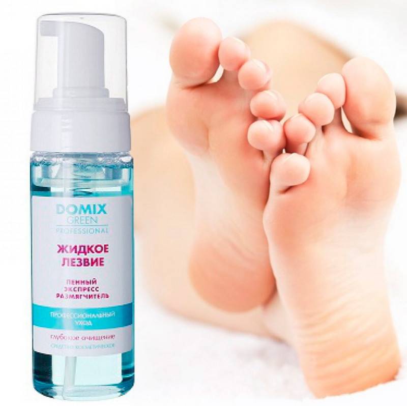 Жидкое лезвие для педикюра по своему действию – это кислотный пилинг. Фруктовые кислоты воздействуют на загрубевшие ткани, не проявляя агрессии по отношению к здоровой коже. В результате все мозоли отслаиваются. Такие препараты выпускают многие фирмы. Отличной репутацией пользуются средства под брендом Domix.
