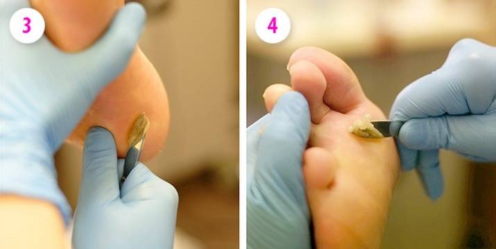 В начале процедуры рекомендуется сделать тёплую ванночку для ног с применением отшелушивающего средства. Лёгкий пилинг позволит более глубоко проникнуть составу препарата вглубь кожи.