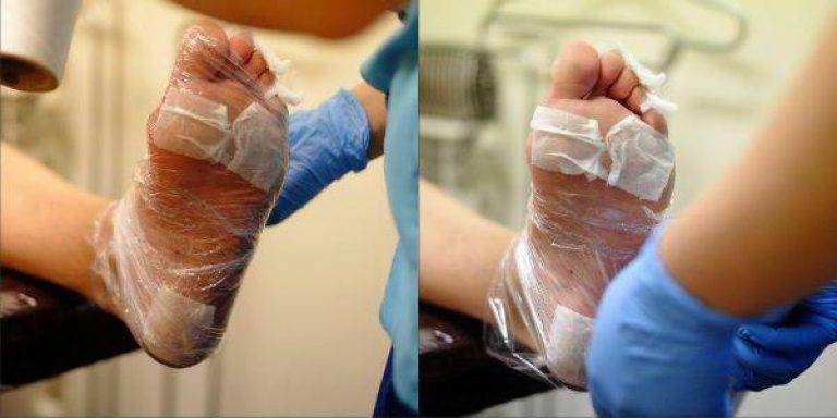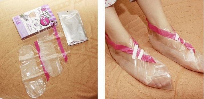 Обработав все огрубевшие участки стоп, нужно укутать ножки целлофановыми пакетиками. Данный состав нужно оставить на ногах на определённое время. Точное время производители обычно указывают на упаковке, обычно это 10-15 минут. По истечении этого времени верхние слои кожи размягчаются и отслаиваются.