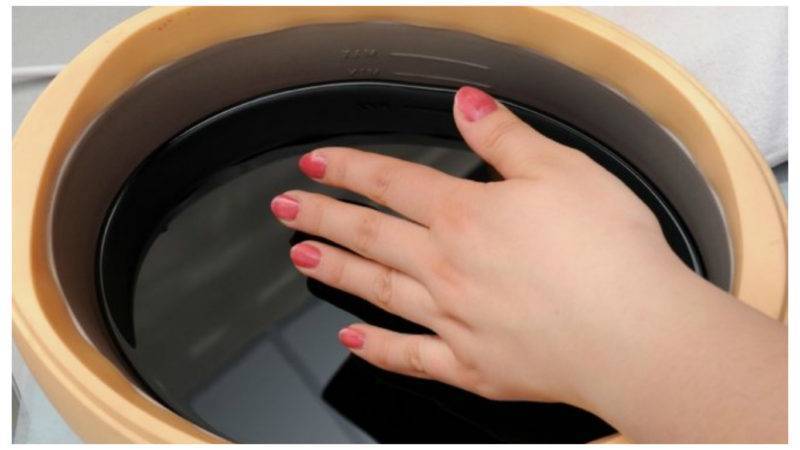 - Размачиванием в жидкости с ацетоном, налитой в емкость. Эту посуду ставят в кастрюлю с горячей водой. В теплый ремувер опускают кончики пальцев и держат, пока покрытие не размокнет. Его удаляют как в предыдущем случае.