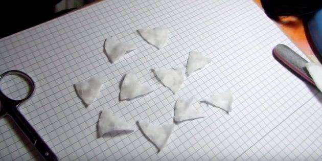 - Ватные диски посредством ножниц разделите на 4 части каждый. То же самое сделайте с фольгой. Всего потребуется по 10 кусочков того и другого материала;
