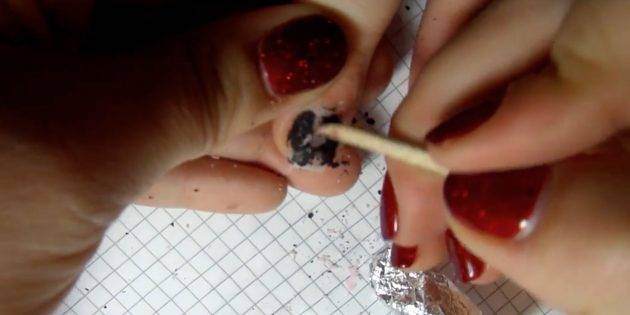 - Нанесите ремувер. Используйте способ с помощью прищепок или фольги. Выдержав время, аккуратно снимайте подготовленными палочками лаковую основу. Апельсиновые палочки необычайно мягкие.