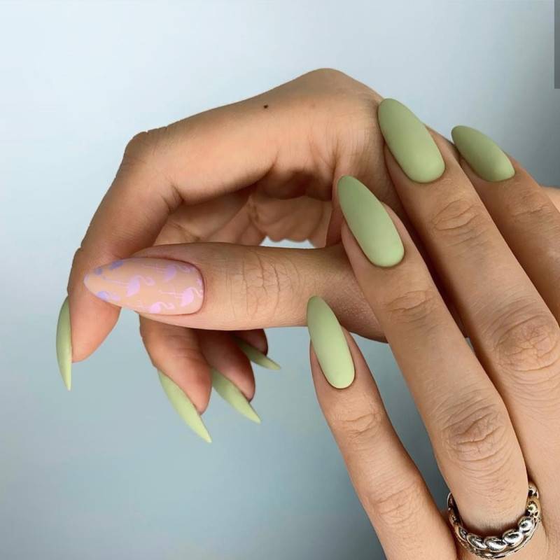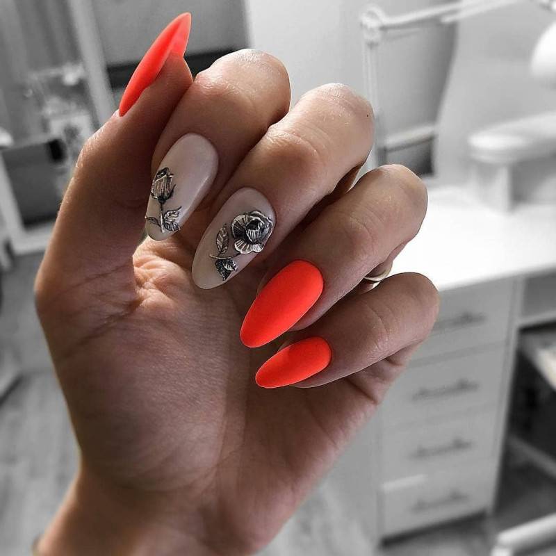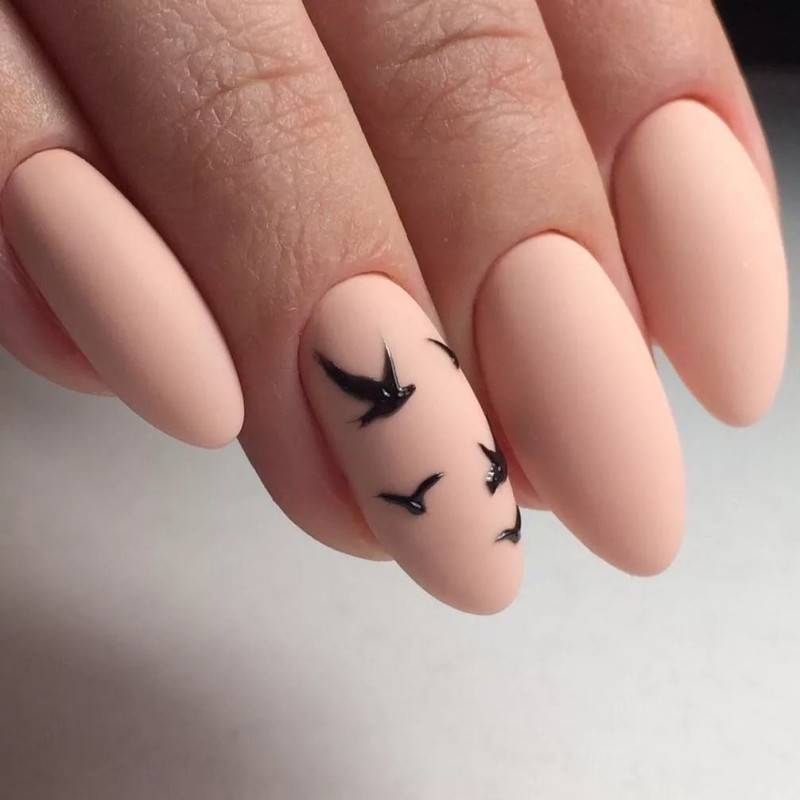Среди всех новинок дизайна лидером будет матовый. Он очень эффектно выглядит на миндальном ногте, помогает образу приобрести изюминку и роскошь. Бархат отлично сочетается с остальными дизайнами, особенно с росписями и цветами.