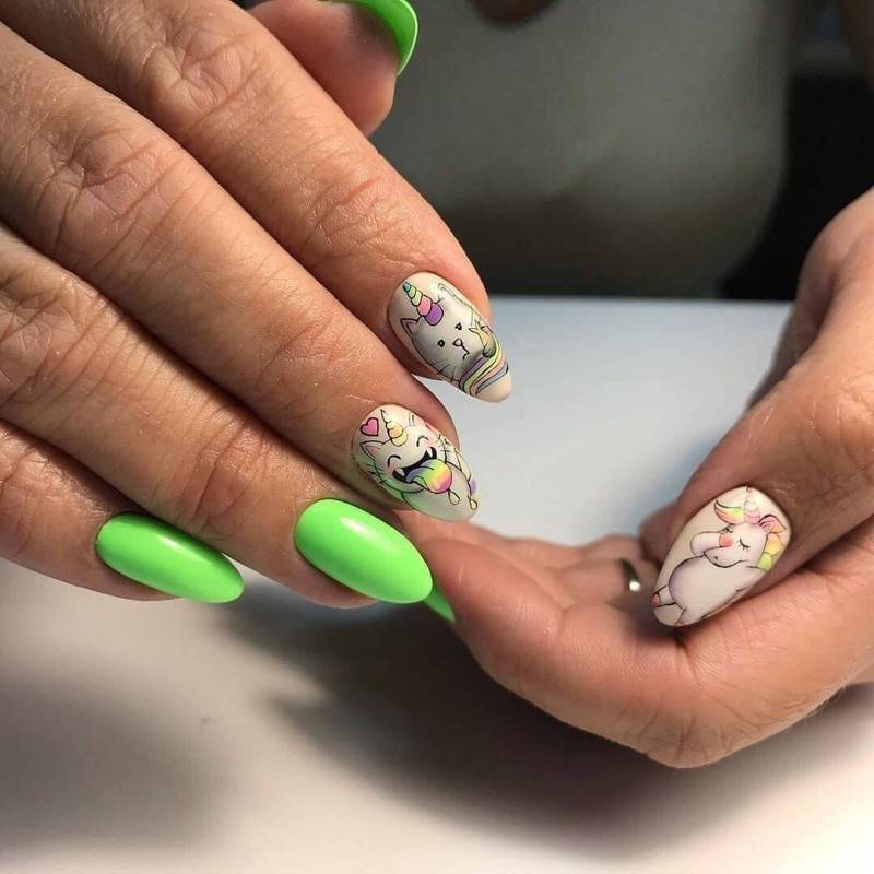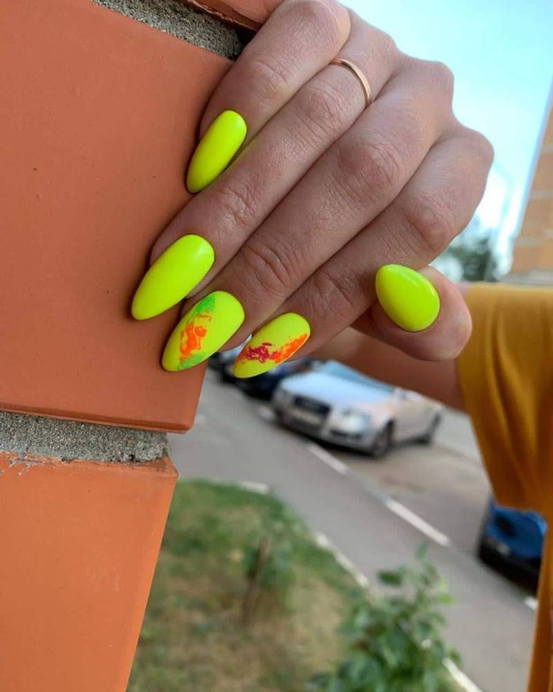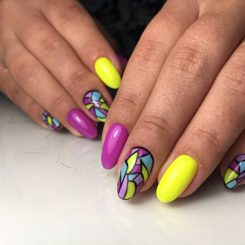 Броские, освежающие дизайны на миндальных ногтях с яркими красками