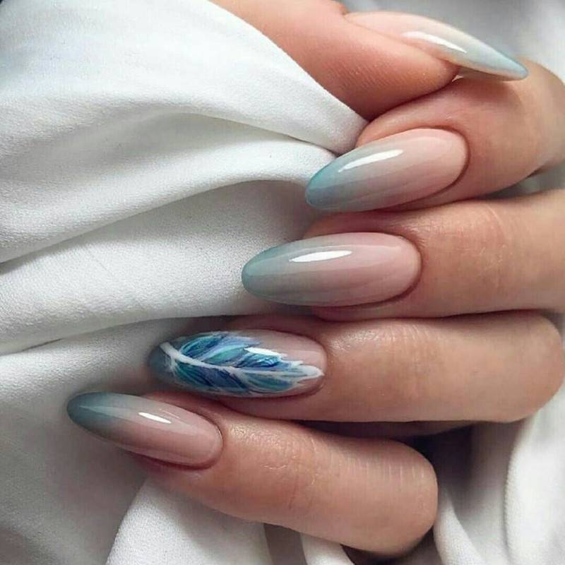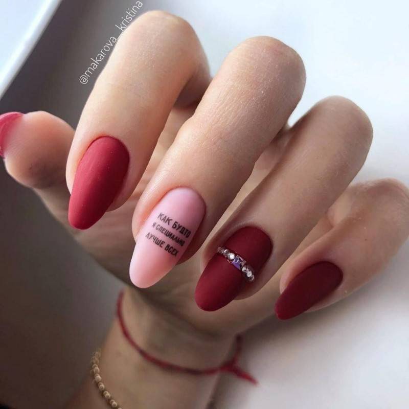 Сейчас в моде смелые эксперименты с дизайном, стемпинг и различные надписи. Сочетание френча и градиента особенно востребовано. Втирка на миндальных ногтях особенно интригующе выглядит, если ее комбинировать с матовым покрытием.